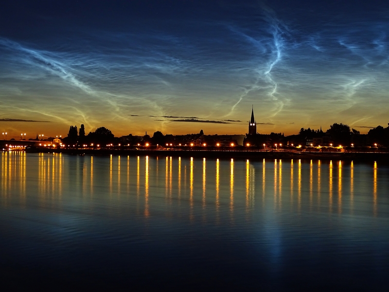 Helles, scharf umgrenztes NLC-Display über dem Rhein in Bonn, aufgenommen am 19.07.2016 um 04:13 MESZ (eigenes Foto)
